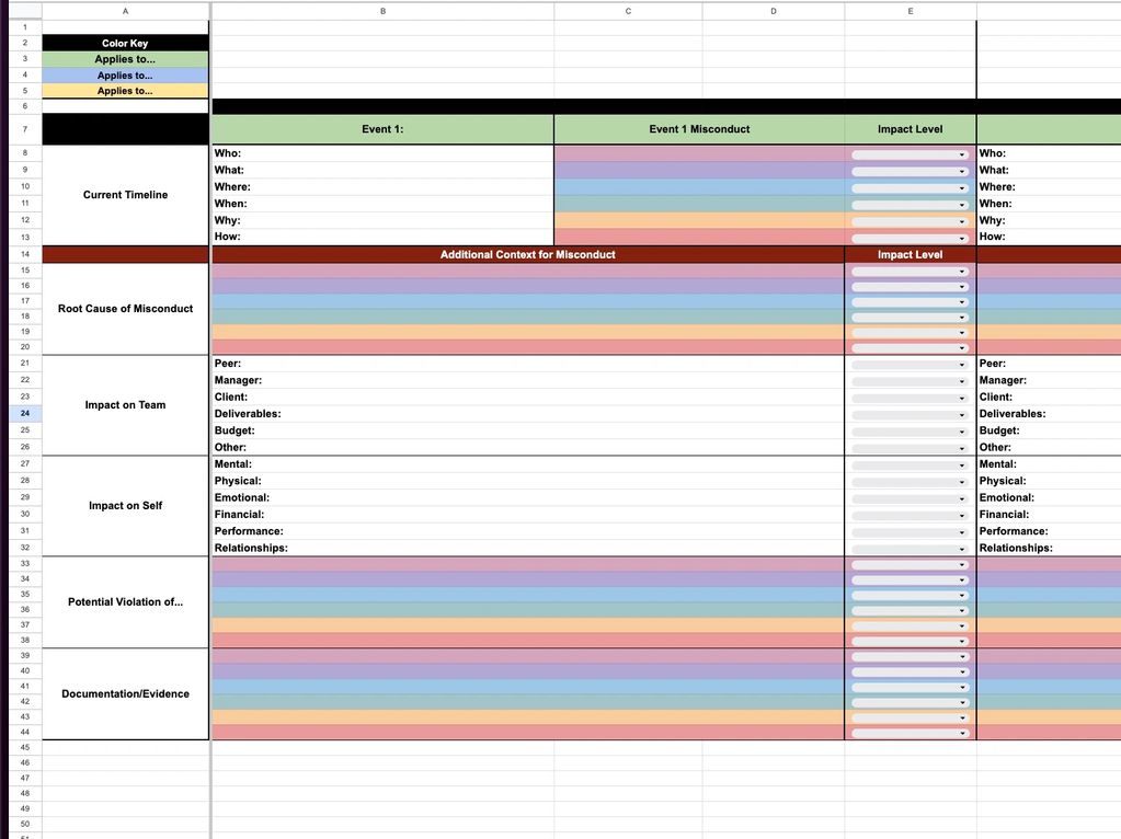 This tool helps you frame your experience through a legal lens — tracking misconduct, mapping impact, and identifying potential violations all in one place.