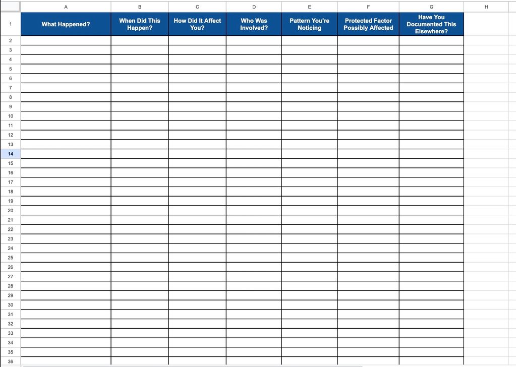 Start here when everything feels like too much. This simple table helps you capture key details — what happened, how it made you feel, and the patterns you’re starting to see. No fancy language. No legal jargon. Just your truth, laid out in a way that makes sense.